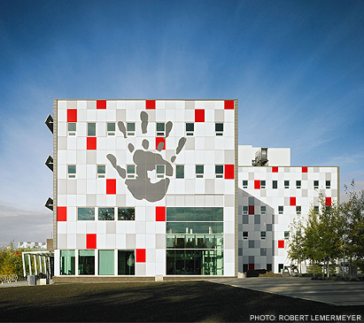 The Child Development Centre (CDC) was conceived to bring together specialists in services for special needs children, including university researchers, medical staff, psychologists and social workers. The main level includes a daycare for 80 children of university staff and students as well as a school for special needs children.