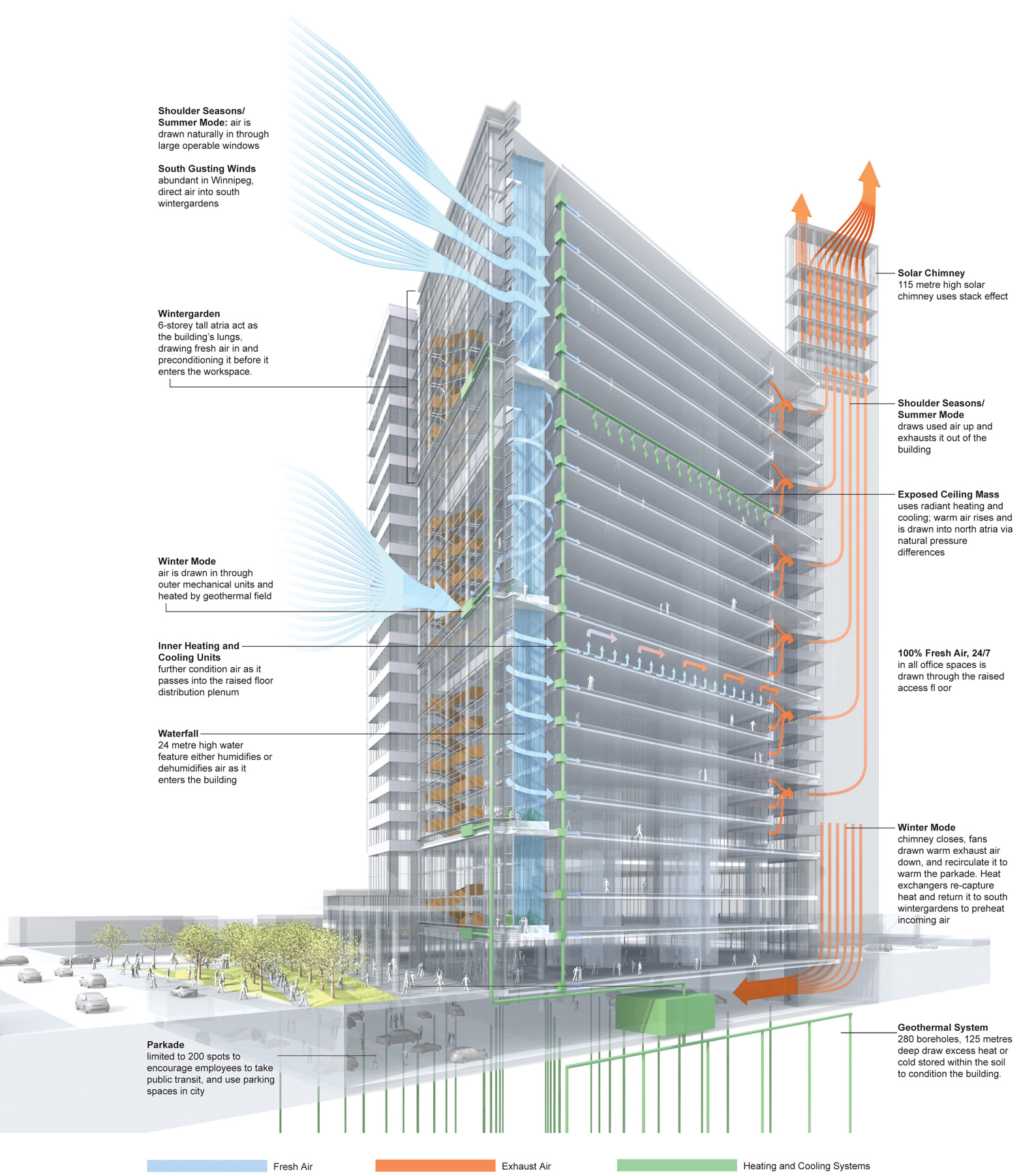 Manitoba Hydro, the primary energy utility in the Province of Manitoba, set ambitious goals for its new headquarters in energy efficiency, urban revitalization, and a supportive workplace. To achieve the seamless integration of design and performance goals, Manitoba Hydro mandated a formal Integrated Design Process (IDP).The 65,000m² 22-storey office tower occupies a full block in the centre of Winnipeg, a city notorious for its extreme climate. Manitoba Hydro demonstrated its commitment to urban revitalization by moving 2000 employees from 12 suburban offices to the new location in Winnipeg’s downtown, which is still in recovery from a severe economic downturn in the late 20th century. Manitoba Hydro Place is a visible sign of commitment on Manitoba Hydro’s part in downtown revitalization. The site, which was previously underused, was selected for its strong connection to the city’s transit system and a raised walkway system that connects the buildings of the downtown core.