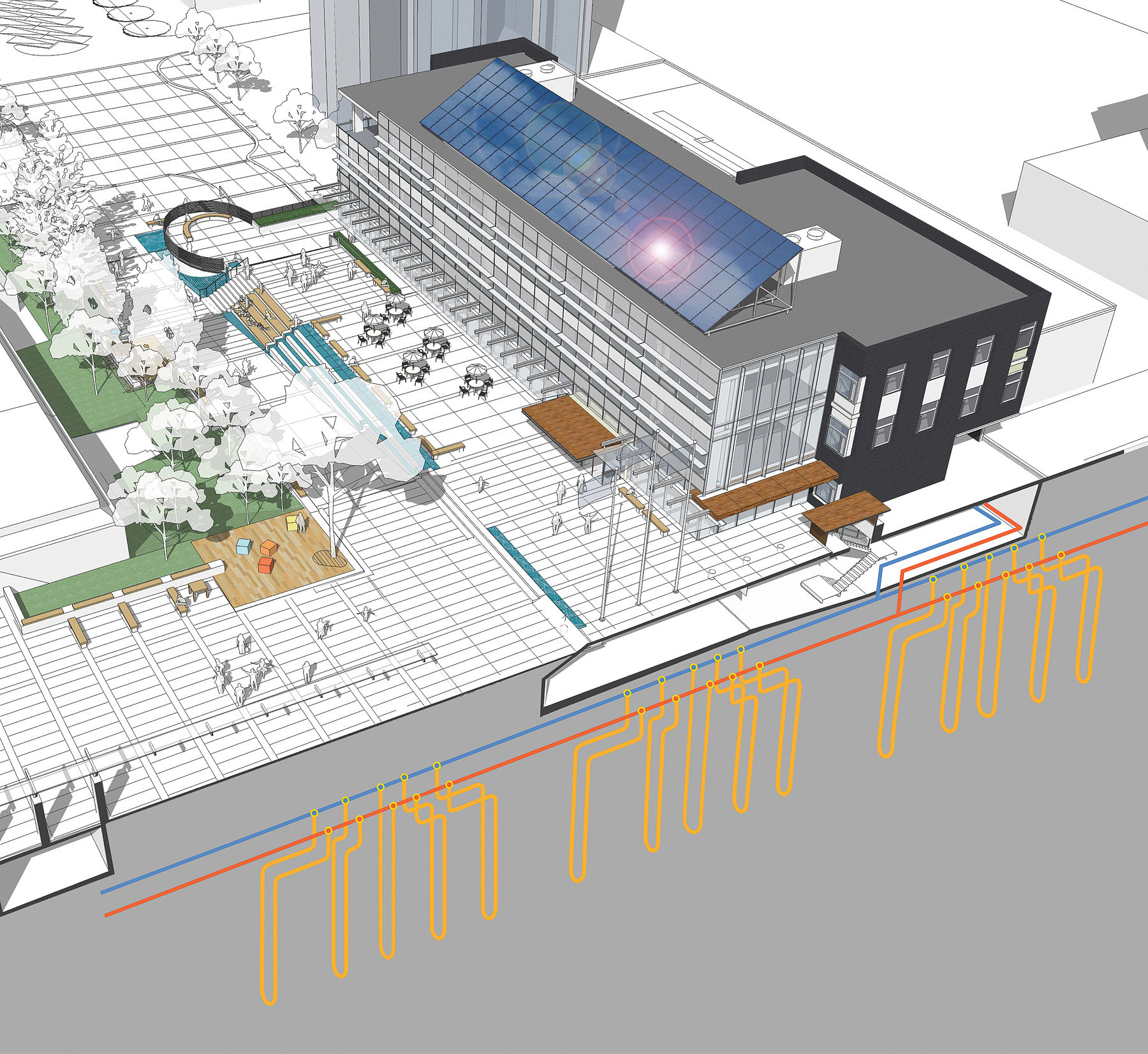 Designed to LEED gold standards, the library is energy efficient utilizing a high performance building envelope, operable windows, and a combination of natural ventilation, radiant heating, geo-exchange cooling and solar energy. The first sustainable district energy plant in Central Lonsdale, located beneath the plaza, provides energy to the library. Additionally, the large array of rooftop solar panels, which follow the south slope of the roof monitor, provide heat for domestic hot water to the neighbouring residential buildings.