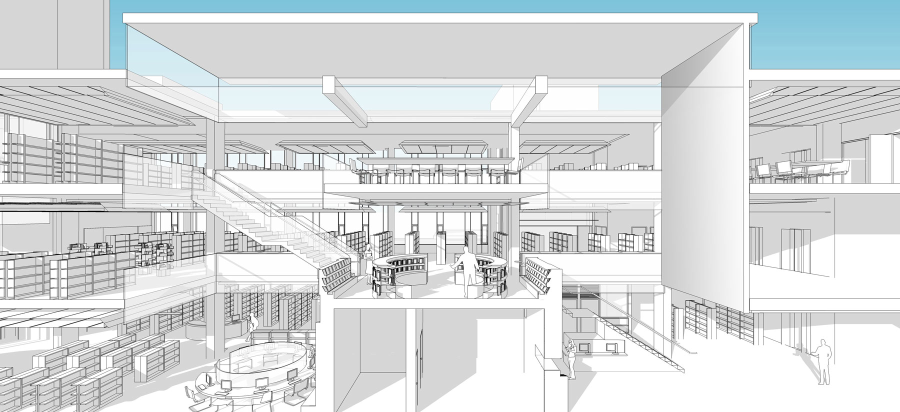In addition to traditional roles of book lending and quiet study space, the new library supports a business / career centre and reading / computer literacy programs. A range of community learning spaces provide flexibility for program alternatives and enhanced public services in a distinctly informal environment.