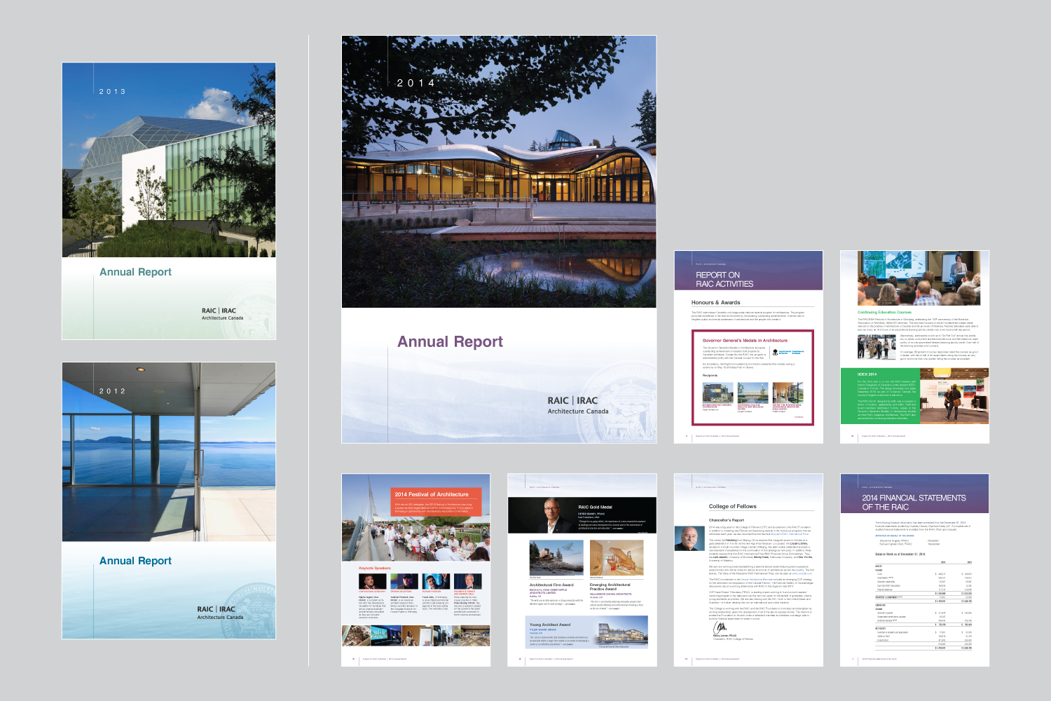 Annual report for the Royal Architectural Institute of Canada, 2003 to 2014 issues (showing 2012 to 2014) / PDF documents, English + French, approx. 34 pages per language / Design, layout, photo editing