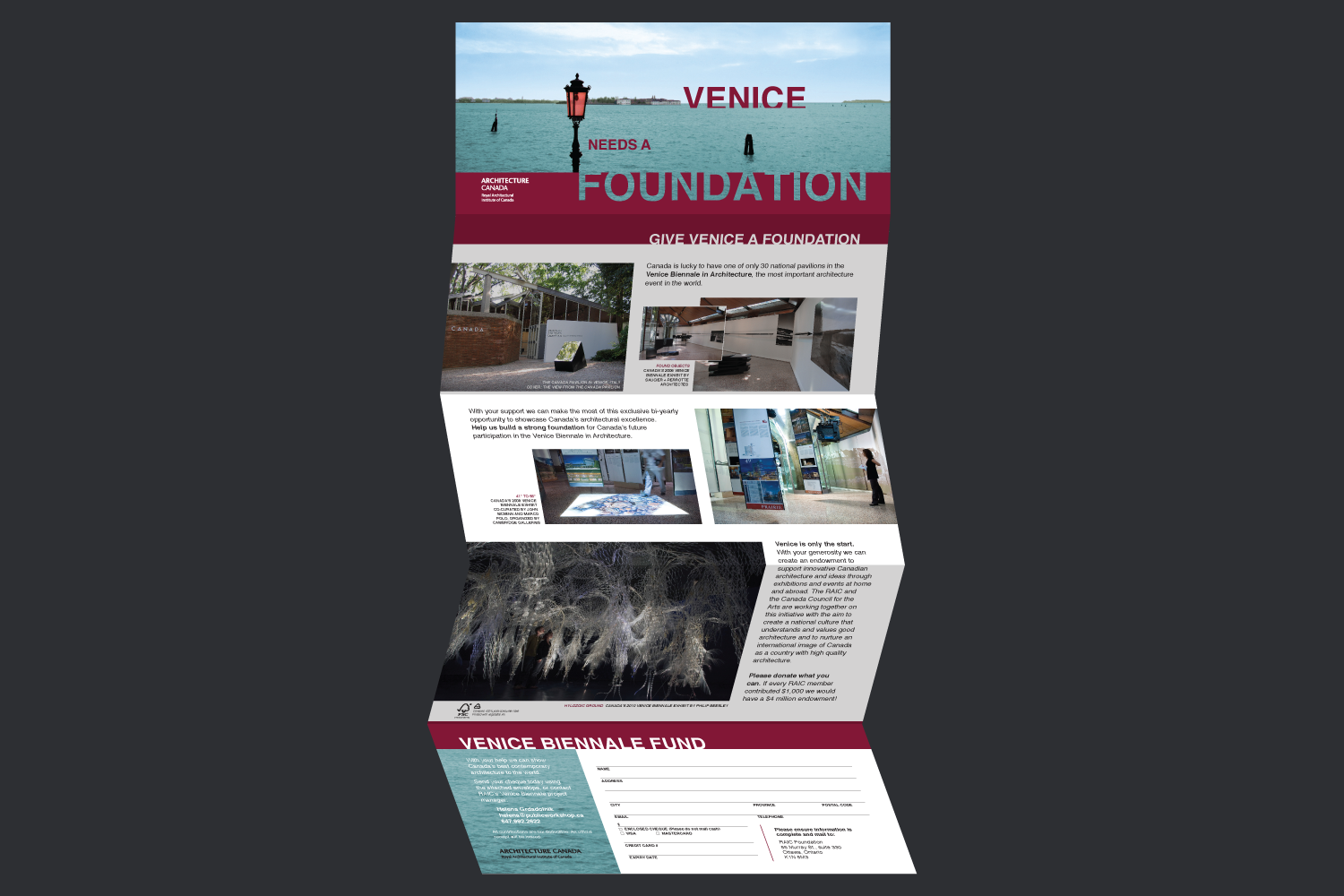 Brochure promoting Canada's participation at the Venice Biennale in Architecture and encouraging contributions / Bilingual tumble format / Distributed as a magazine insert and to attendees at social events