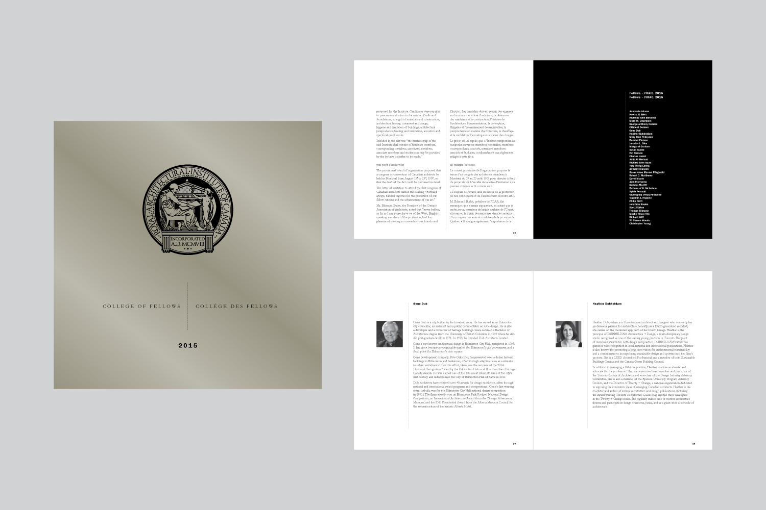 Yearly book featuring the new members elected into the Royal Architectural Institute of Canada's College of Fellows, 2006 to 2015 editions / Approx. 72 pages, metallic ink on cover / Layout and photo editing