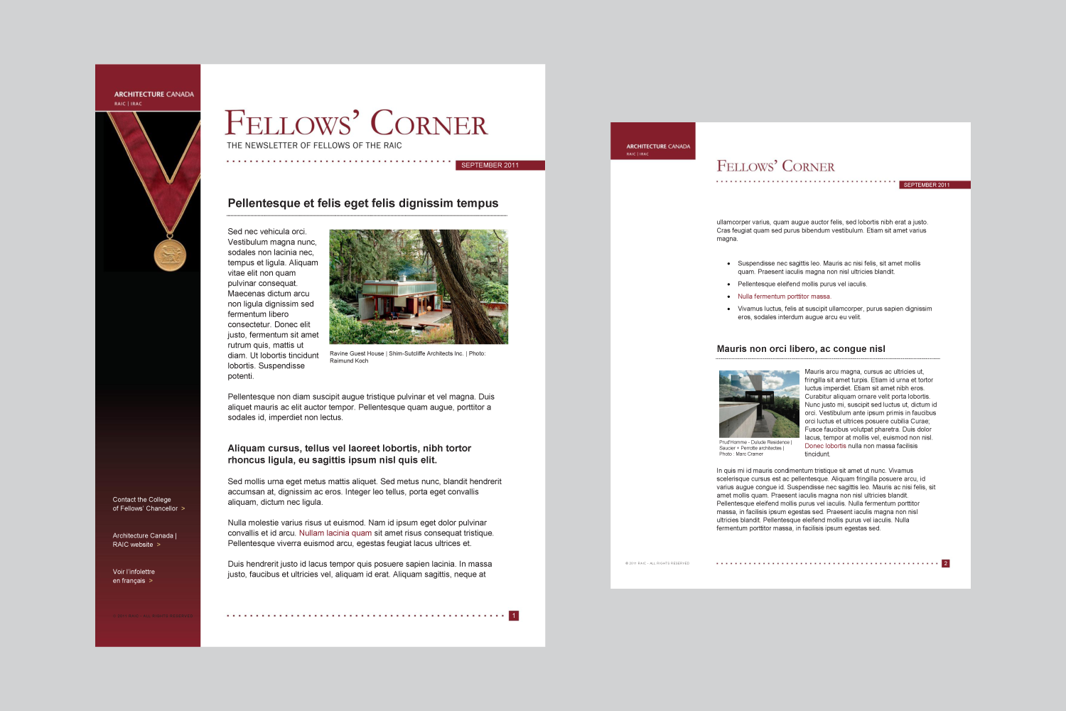 Design of newsletter template for the Royal Architectural Institute of Canada's College of Fellows / Created as an MS Word document for ease of use (layout executed by individuals with basic knowledge)