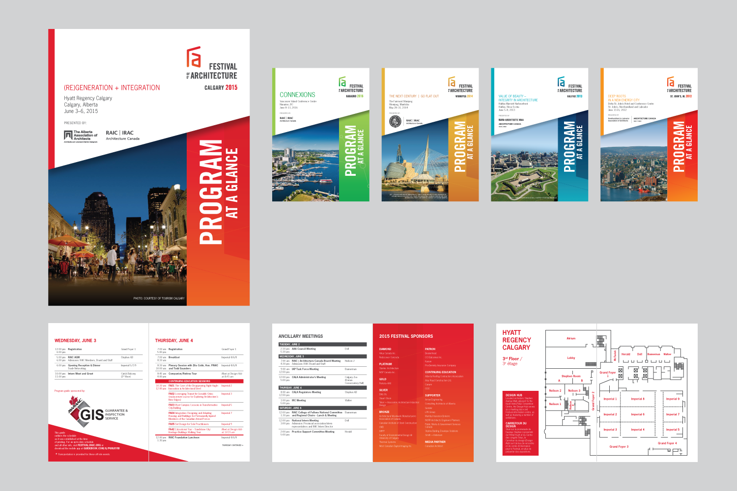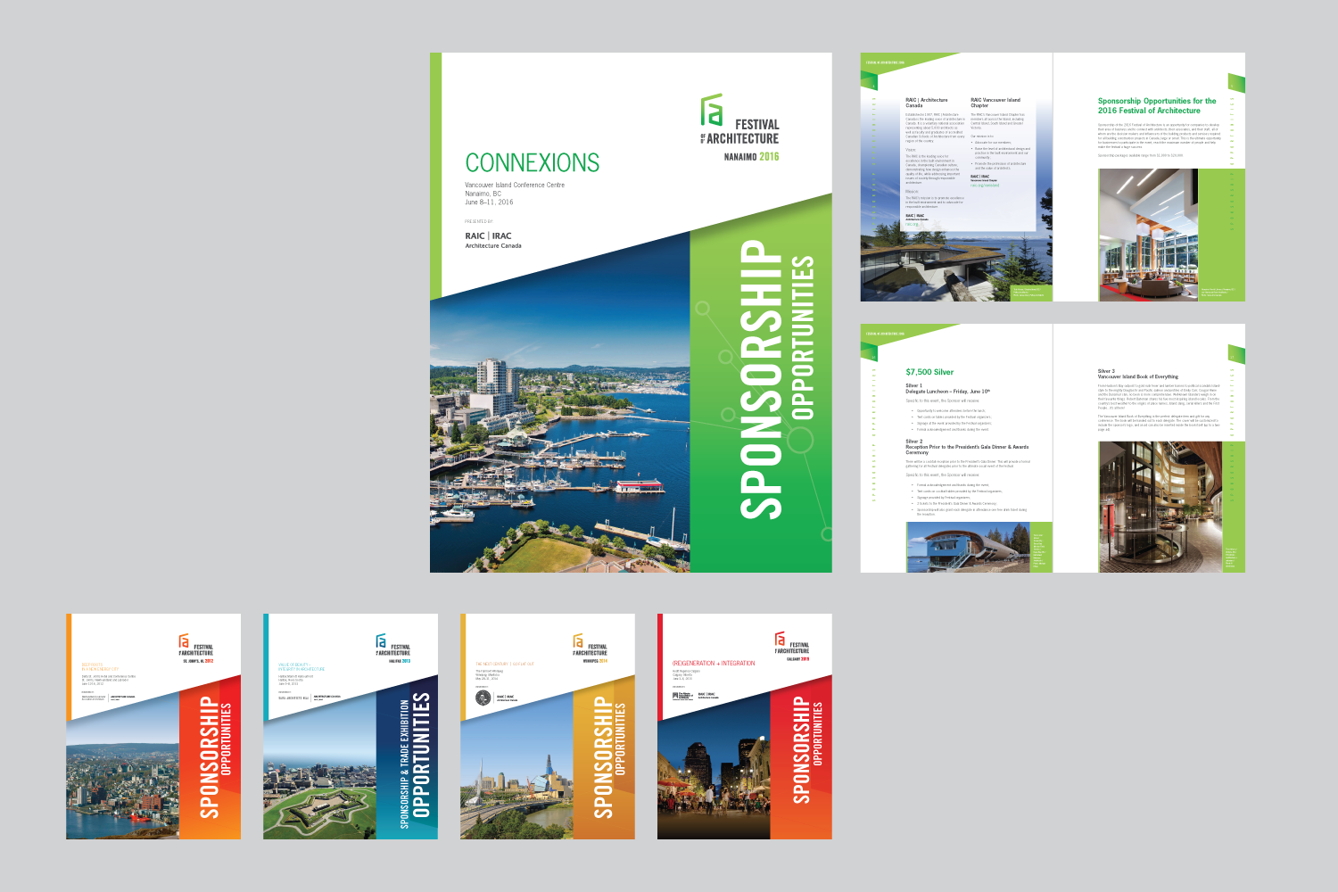Brochure promoting sponsorship for the Royal Architectural Institute of Canada's annual conference, 2012 to 2016 editions / 20 to 24 pages, printed and PDF document formats / Design and layout