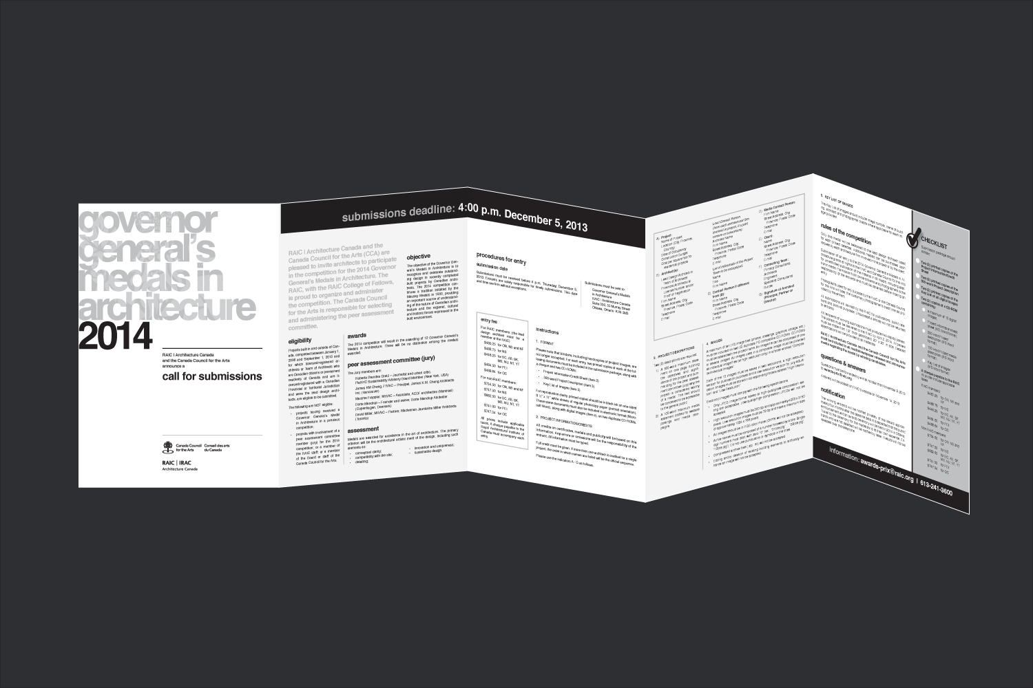 Brochure inviting architects to submit their projects for the Governor General's Medals in Architecture, 2014 edition / Bilingual tumble format / Distributed as an insert in Canadian Architect magazine