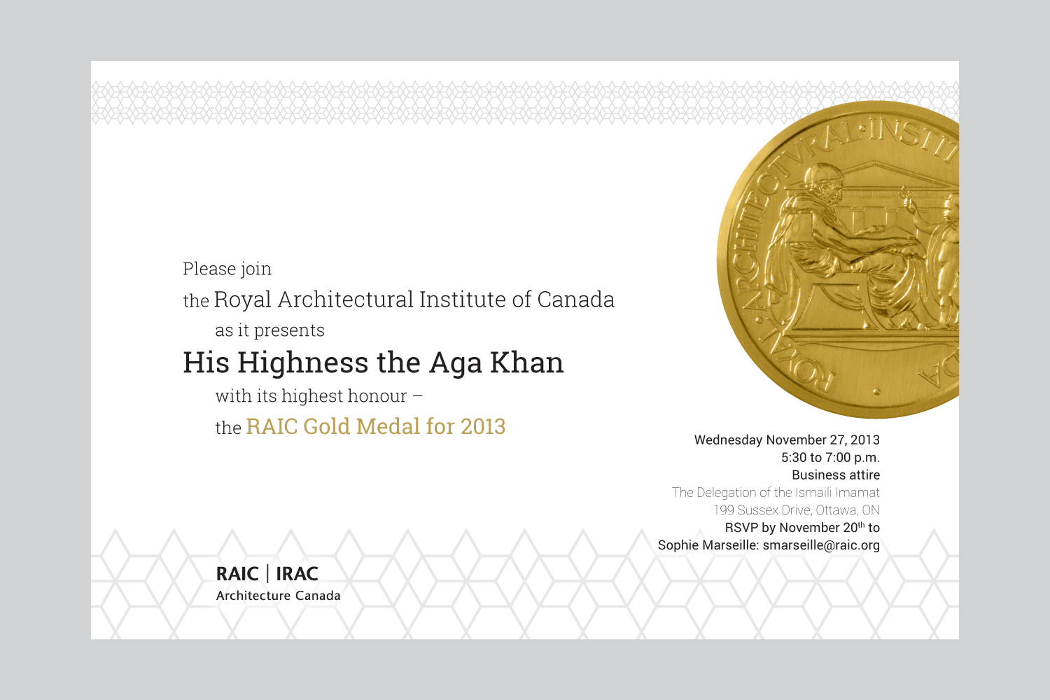 Postcard invitation for the presentation of the Royal Architectural Institute of Canada's highest honour / The pattern at the top and bottom edges recalls an architectural feature from the building where the ceremony is being held, the Delegation of the Ismaili Imamat