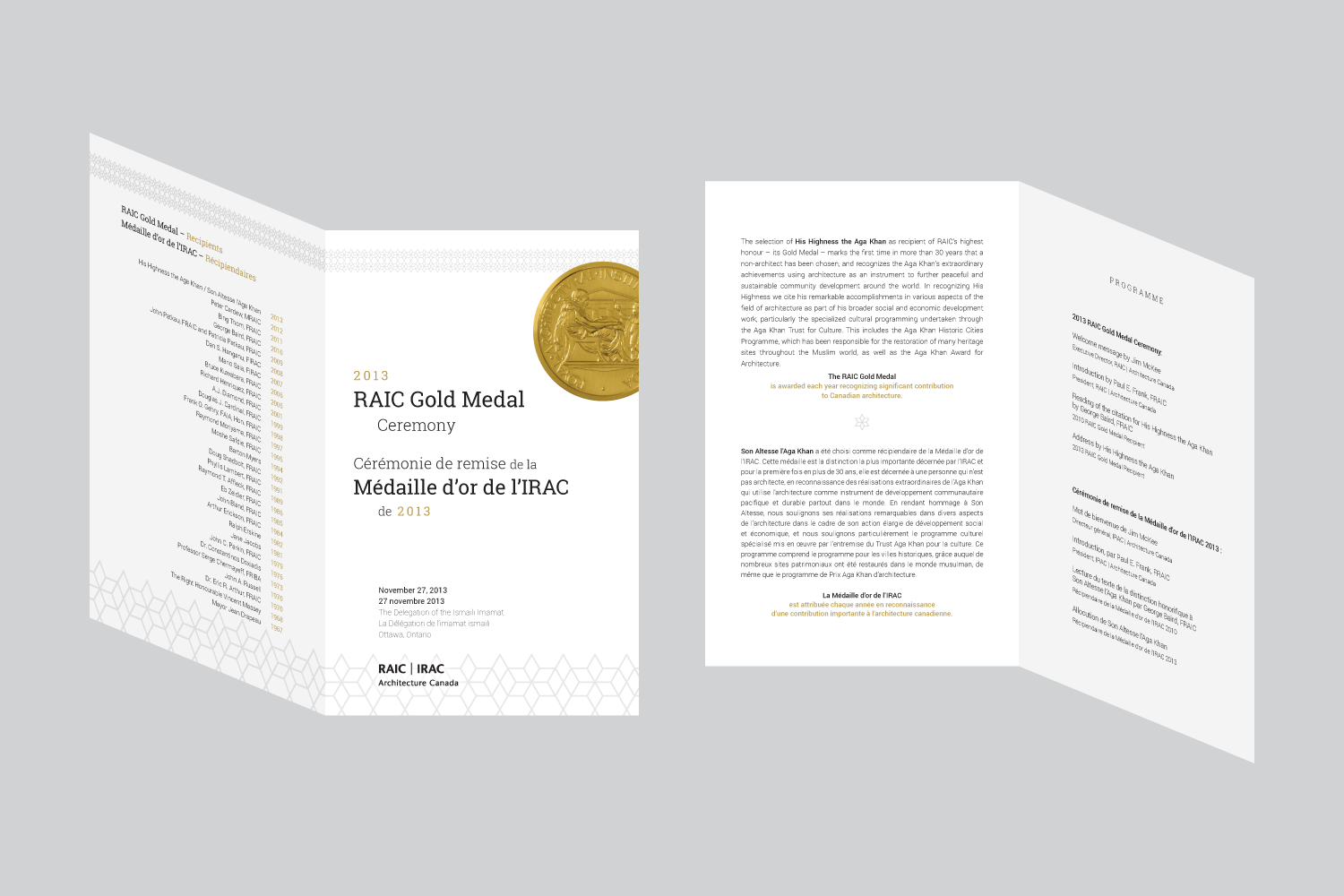 Ceremony program booklet for the presentation of the RAIC Gold Medal / On the cover, the pattern at the top and bottom edges recalls an architectural feature from the building where the ceremony is being held, the Delegation of the Ismaili Imamat