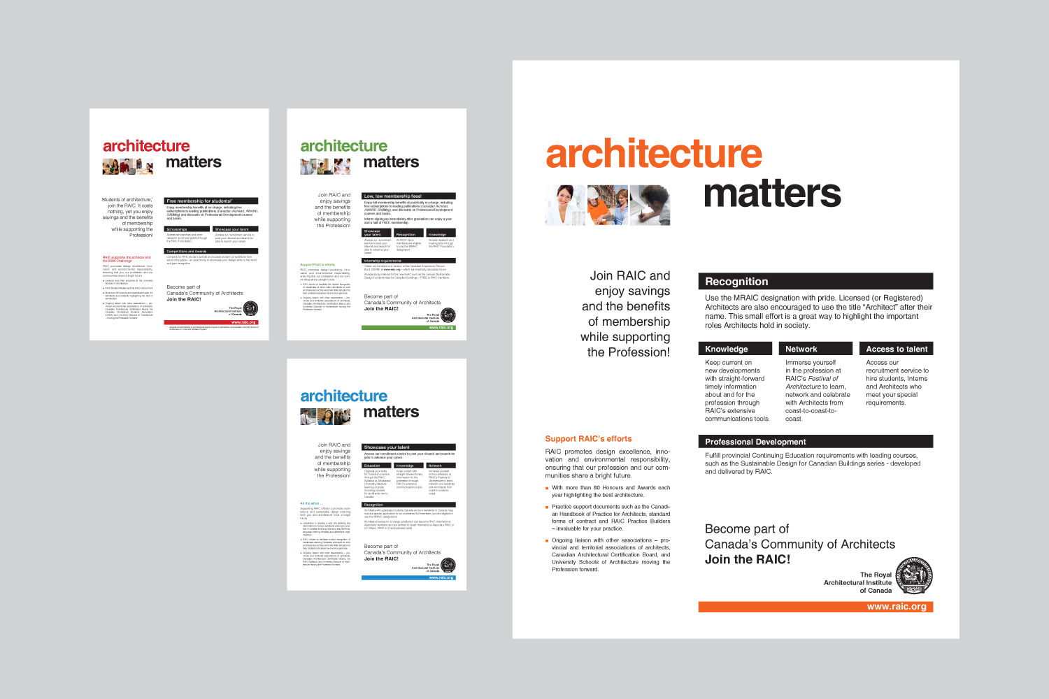Series of factsheets promoting benefits of membership with the Royal Architectural Institute of Canada / Each factsheet is tailored for a specific target audience: Licensed Architects, Foreign Architects, Intern Architects, Architecture Students