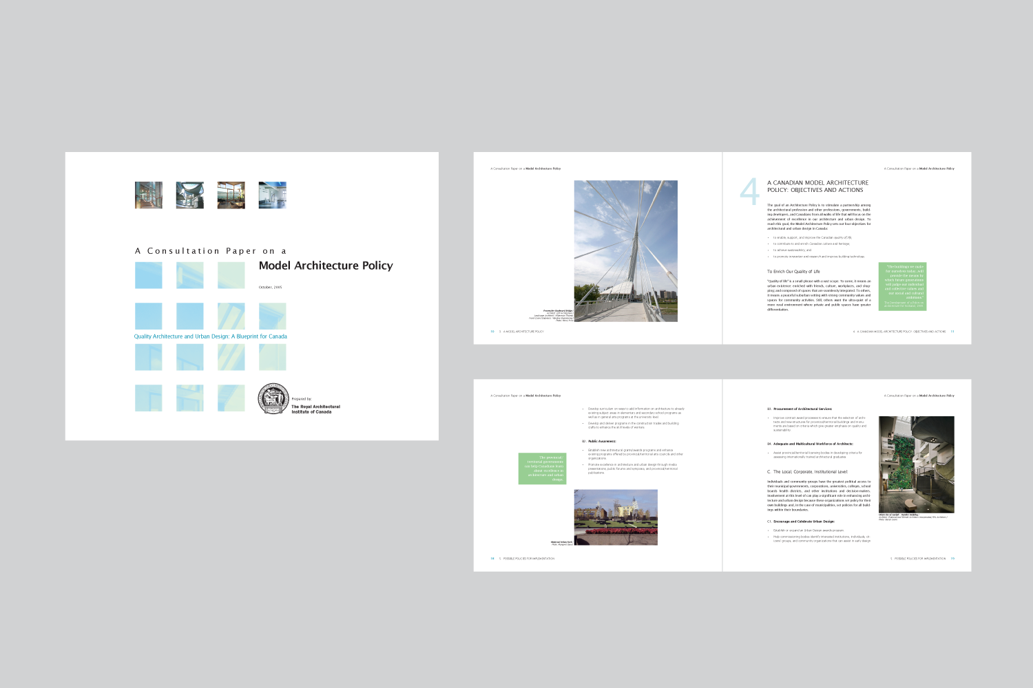 Booklet promoting the importance for the creation of a policy on architecture and urban design in Canada / English + French, 32 pages per language / Design and layout
