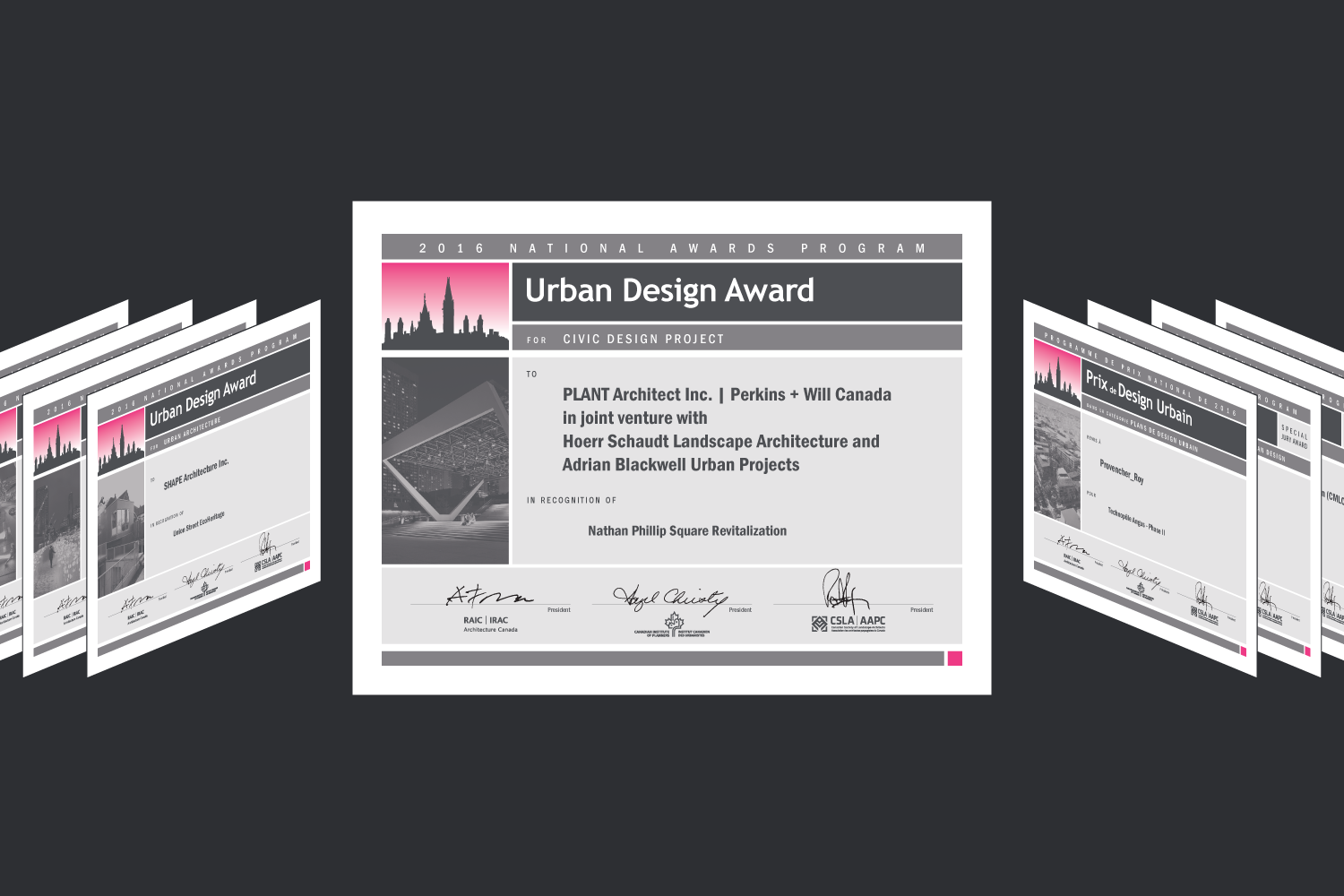 Certificates for recipients of the National Urban Design Awards, 2006 to 2016 editions (showing 2016) / Each personalized certificate includes an image of the winning project
