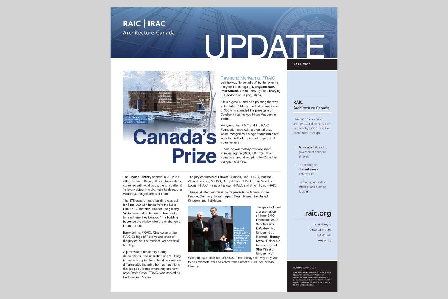 Newsletter for the Royal Architectural Institute of Canada / Published quarterly in Canadian Architect magazine / English + French / Design and layout