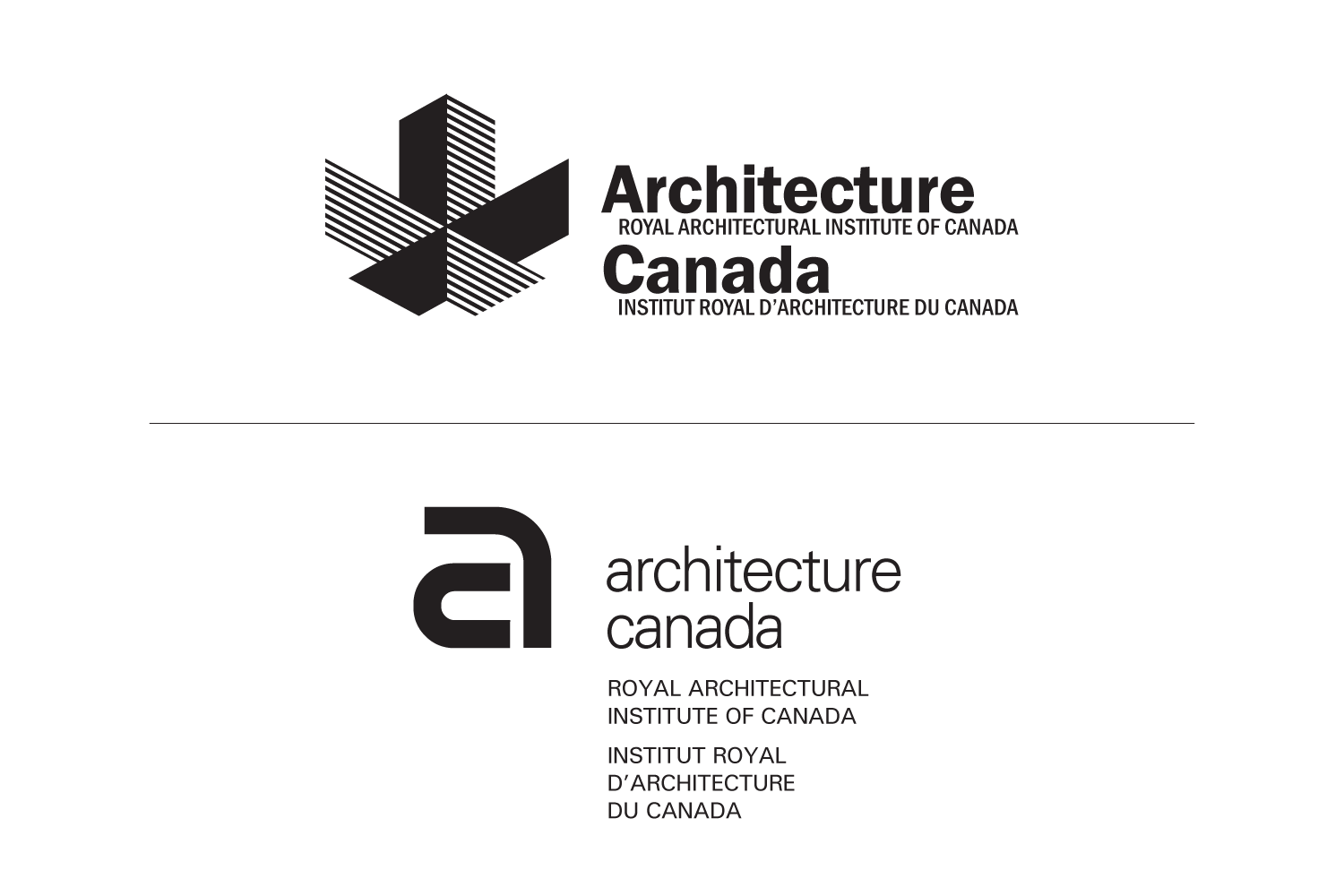 Logo proposals for the rebranding of the Royal Architectural Institute of Canada to a new name / At top: stylized maple leaf with segments evoking architectural shapes / At bottom: the complete shape forms a lowercase "A" with a "C" in the lower portion