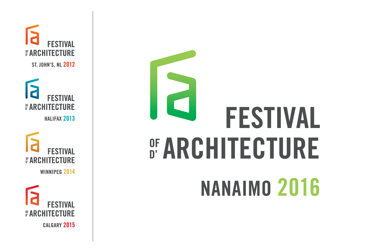 Logo for the Royal Architectural Institute of Canada's annual conference, 2012 to 2016 editions / A play on the acronym where the "F" appears in the negative space formed between the coloured element on the left and the lowercase "A" on the right.