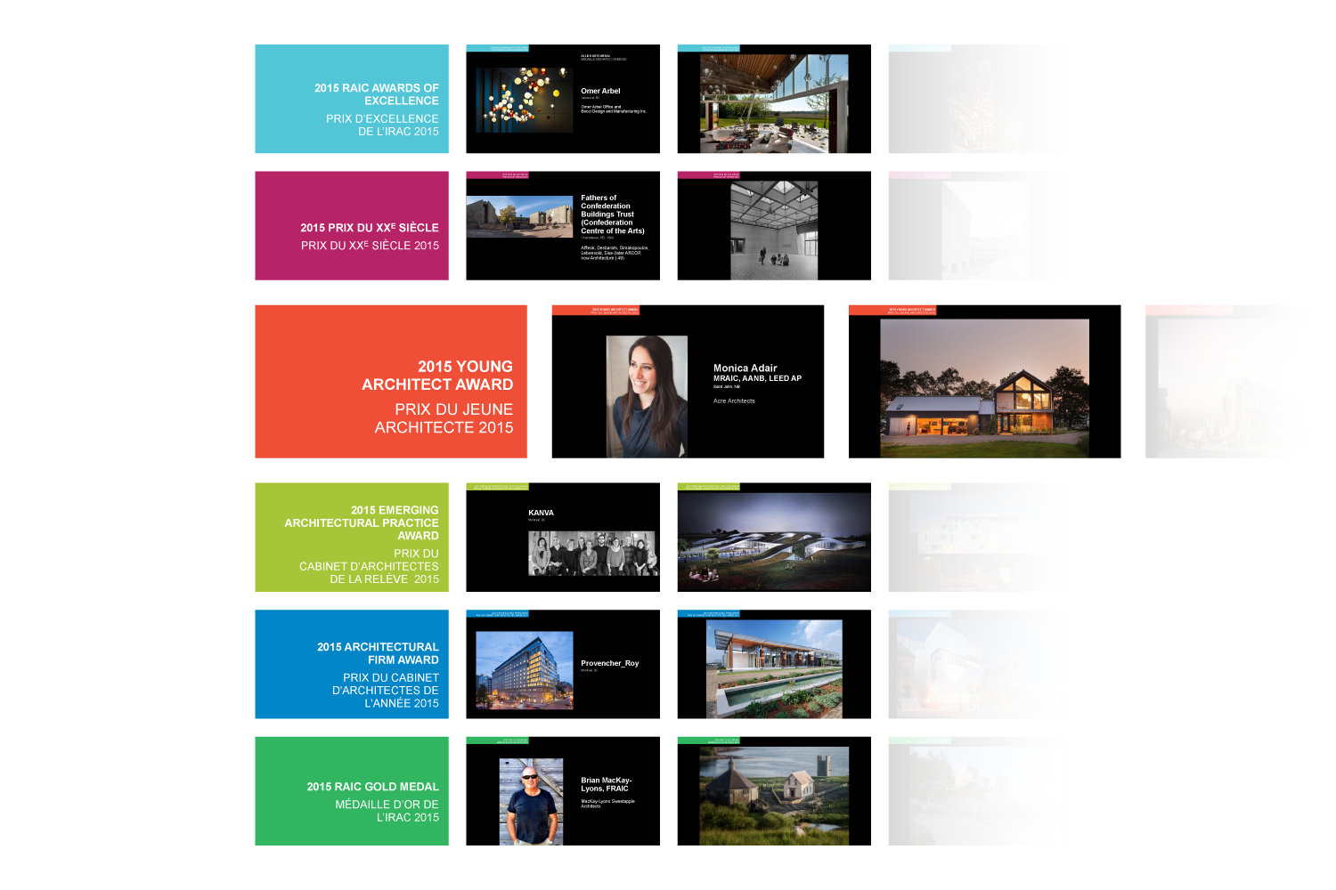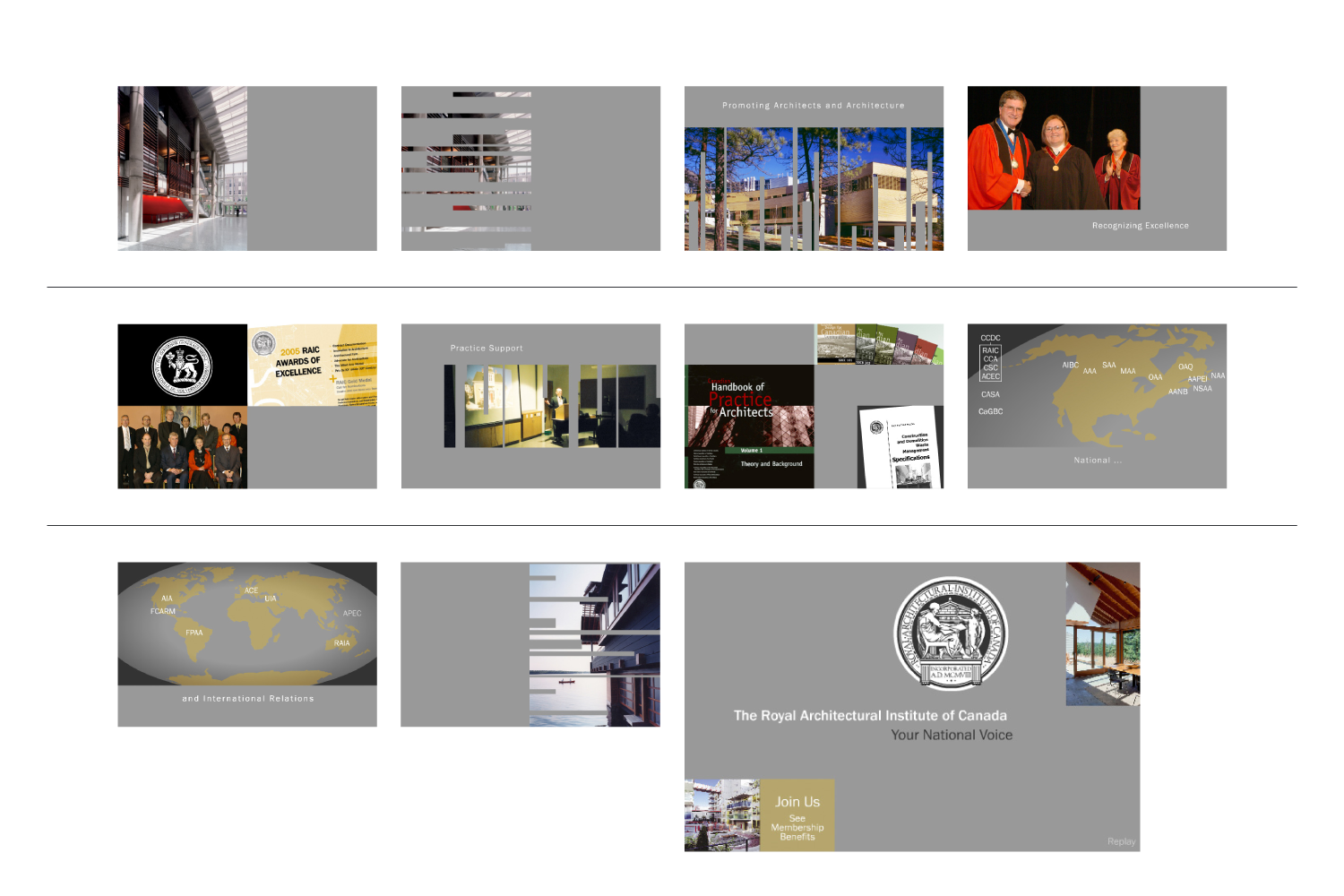 PowerPoint presentation promoting awards and main activities of the Royal Architectural Institute of Canada / On display at the RAIC booth at IIDEXCanada national design + architecture expo and conference in Toronto / Looping and autoplay