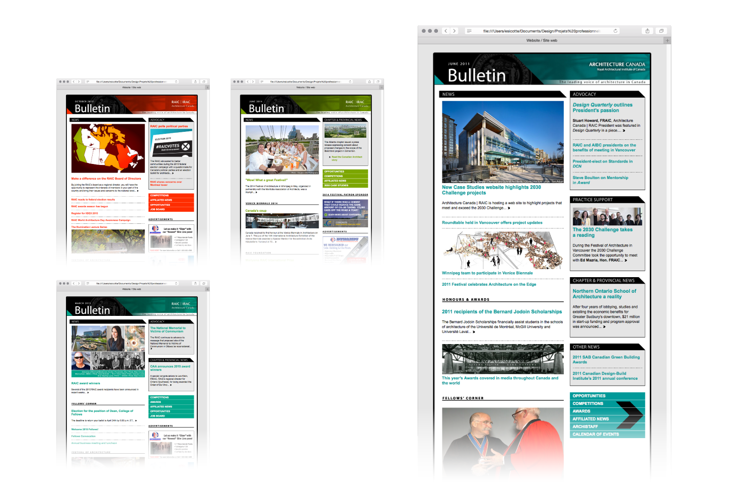 Newsletter for the Royal Architectural Institute of Canada, 2009 to 2015 / Design of graphic user interface, HTML+CSS programming (template), illustration, photo editing