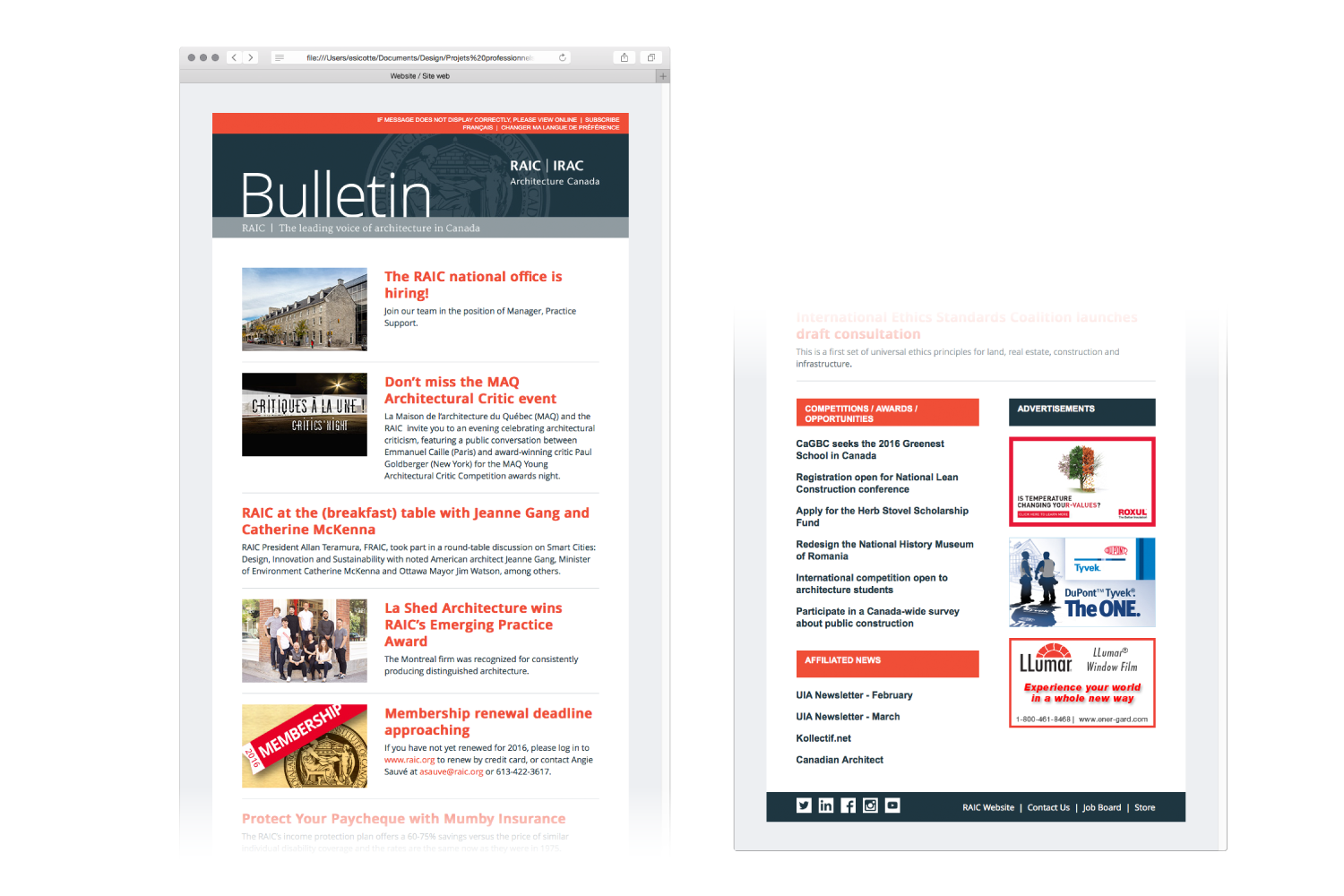 Newsletter for the Royal Architectural Institute of Canada, 2016 to 2017 / Design of graphic user interface, HTML+CSS programming (template), illustration, photo editing