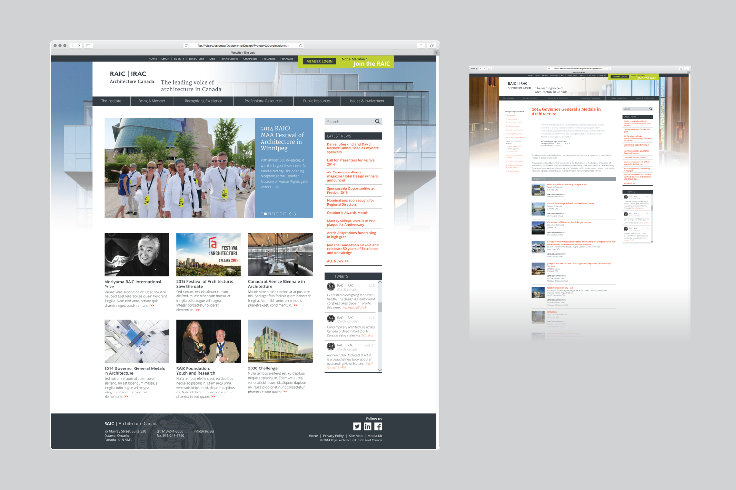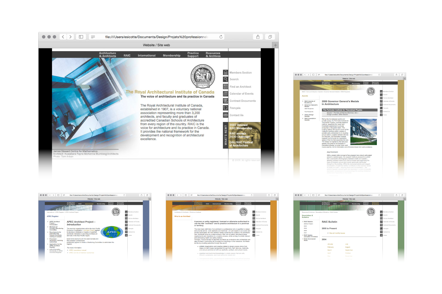 Website for the Royal Architectural Institute of Canada, 2005 to 2014 / Design of graphic user interface, HTML+CSS programming, layout / Sections of the website are identified by colour
